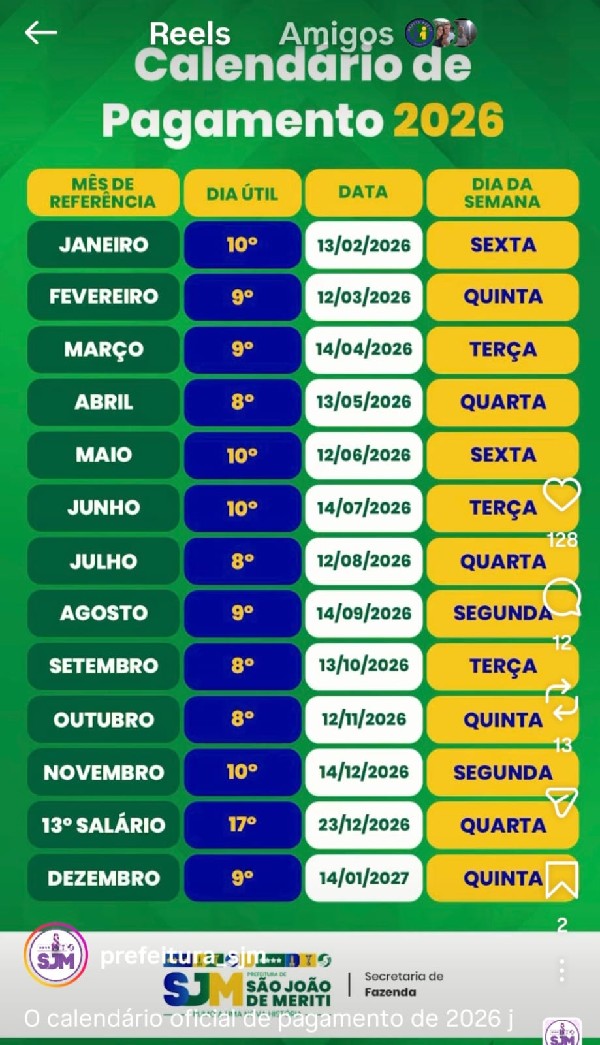 Foto: Calendário oficial de pagamento dos servidores municipais de São João de Meriti para 2026 mostra as datas previstas para os depósitos mensais e do 13º salário.